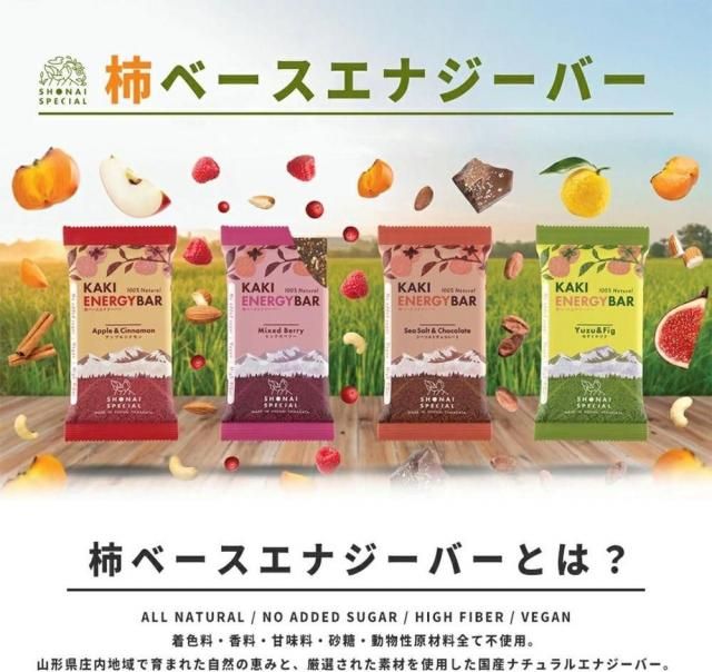 食物繊維が豊富な庄内柿をベースに、有機発芽玄米粉やナッツ、オーツなど植物由来の原材料を組み合わせ、様々な栄養素をバランス良く摂取できるナチュラルエナジーバー。